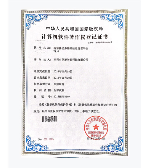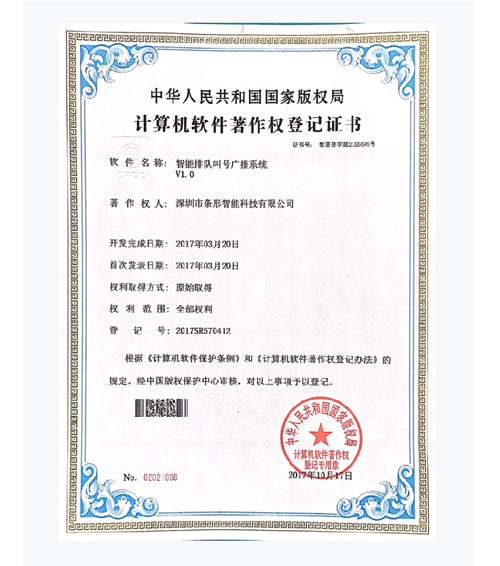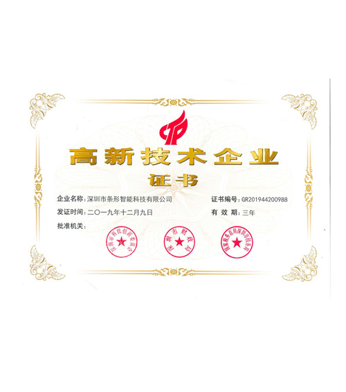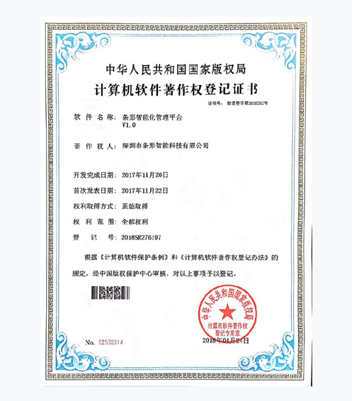 深圳條形智能先后通過并取得:全國工業(yè)產(chǎn)品生產(chǎn)許可證、ISO9001國家質(zhì)量體系認(rèn)證、CE認(rèn)證、多項發(fā)明和實用新型專利,及多項國家軟件著作權(quán)。